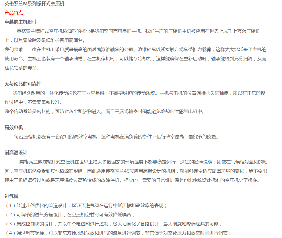 •        濟南銳博特機械設(shè)備有限公司是英格索蘭空氣壓縮機的授權(quán)代理商,代理銷售美國英格索蘭全系列的空壓機及后續(xù)處理設(shè)備。公司自成立以來,經(jīng)過公司全體同仁不斷努力,開拓創(chuàng)新,以優(yōu)良的技術(shù)、完善的售后服務(wù),使得公司贏得了一個又一個的誠心客戶。我公司擁有多名專業(yè)的銷售及售后服務(wù)人員,為客戶提供空壓系統(tǒng)的售前、售中及售后的全方位優(yōu)質(zhì)服務(wù)。另公司有多名具有英格索蘭壓縮機授權(quán)服務(wù)證書的服務(wù)工程師,能維修和保養(yǎng)國內(nèi)外各種品牌空壓機,公司各種國內(nèi)外品牌空壓機配件庫存齊全。